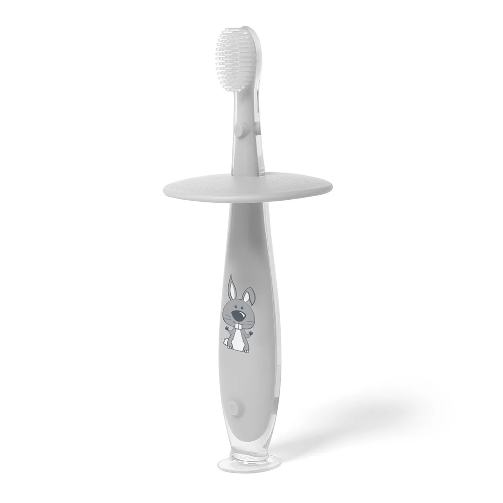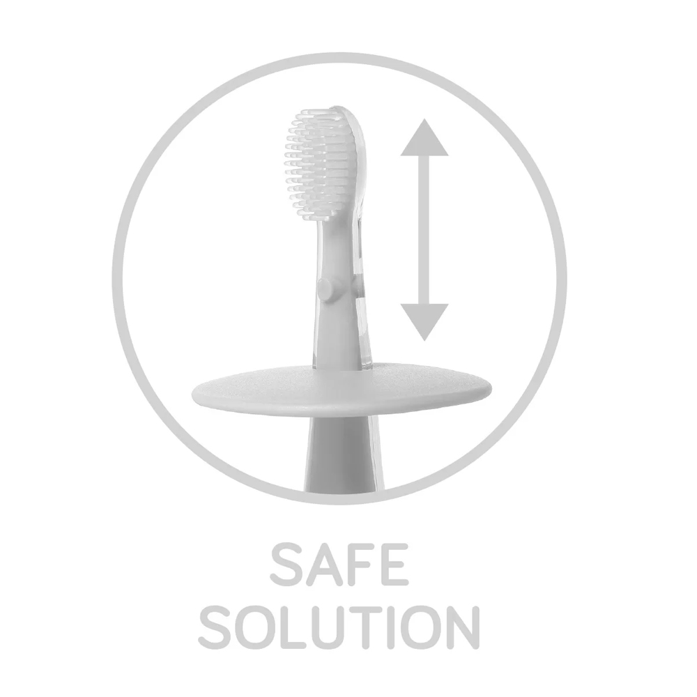 Nježna silikonska četkica za zube s graničnikom za zaštitu od predubokog umetanja u usta. Namijenjen je za svakodnevnu oralnu higijenu. Zahvaljujući veselom dizajnu, pranje zubi postaje zabavno. Savršeno za učenje djece kako samostalno prati zube.
