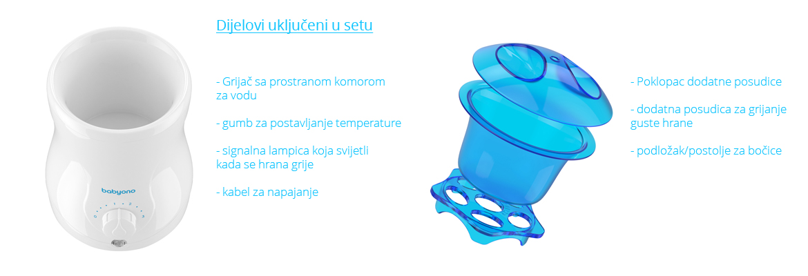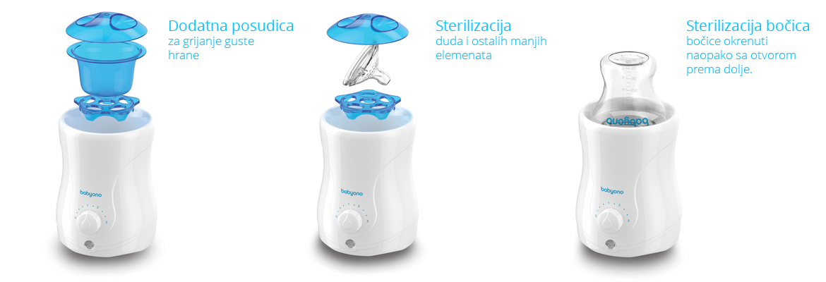 BabyOno električni grijač hrane i sterilizator Natural Nursing je stvoren za roditelje koji cijene modernost, praktičnost i istodobno svestranost proizvoda. Ovaj grijač ne služi samo za brzo zagrijavanje hrane, nego služi i kao sterilizator. Jednostavno možete sterilizirati dude, grickalice ili bočice. Grijač također ima dodatnu posudicu za zagrijavanje guste hrane i kompatibilan je s većinom bočica dostupnih na tržištu.