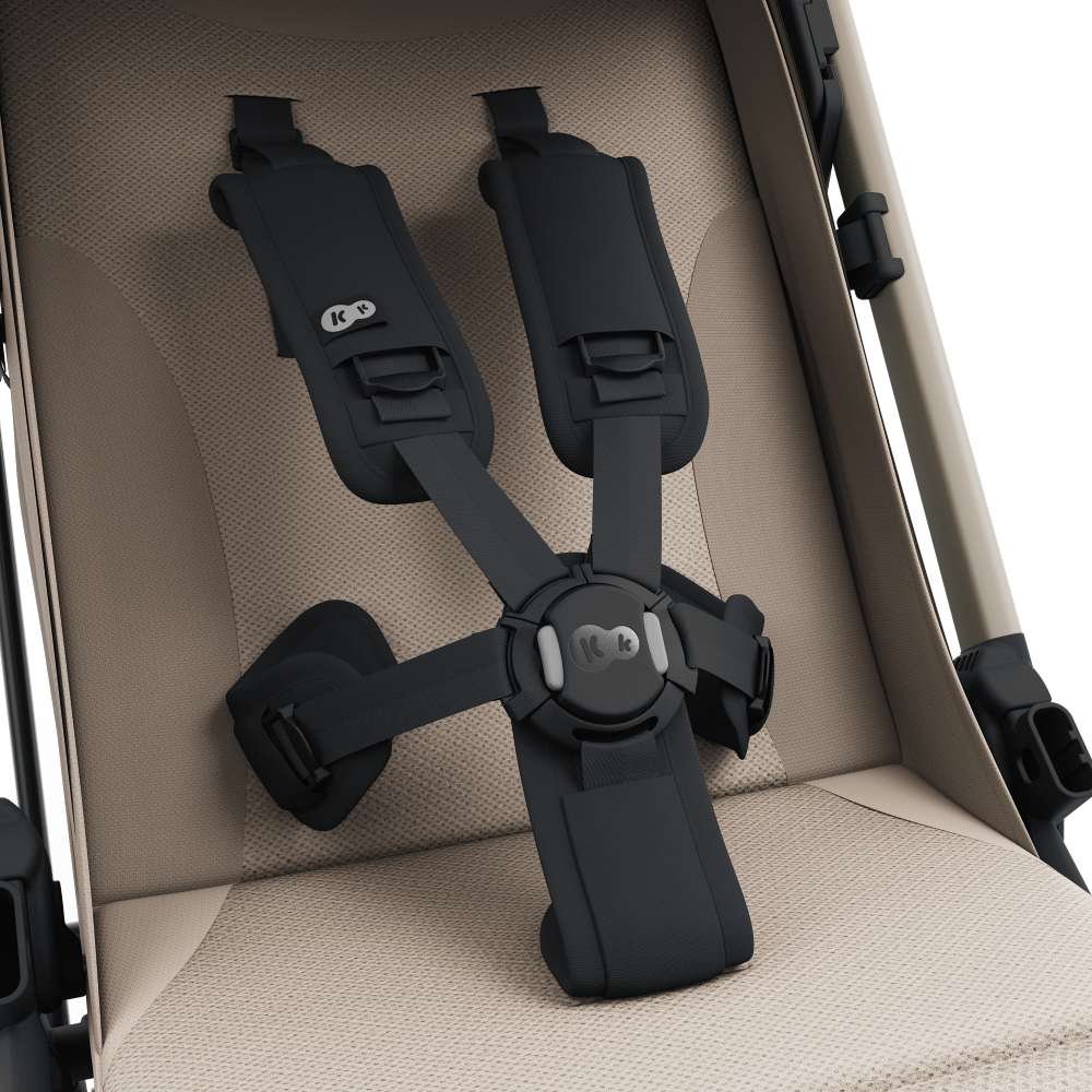 Kolica su opremljena amortiziranim kotačima, prilagođenima svim terenima. Prednji kotači se okreću za 360°, omogućujući laku vožnju po gradskim ulicama i neravnim stazama. Sigurnosni pojasevi u pet točaka pružaju dodatnu sigurnost. Ergonomska ručka omogućuje ugodno guranje bez napora.