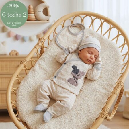 Osigurajte svom mališanu maksimalnu udobnost od prvog dana uz naš preslatki trodijelni komplet. Dizajniran s posebnom pažnjom prema osjetljivoj bebinoj koži, ovaj set spaja vrhunsku mekoću i praktična rješenja koja roditeljima olakšavaju svakodnevicu.