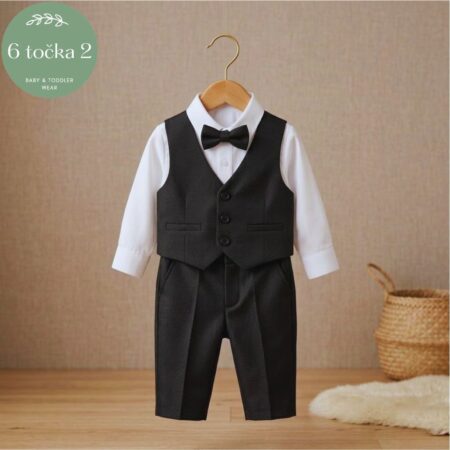 Osigurajte svom mališanu besprijekoran izgled na njegov prvi veliki dan! Ovo elegantno crno odijelo dizajnirano je za posebne prigode poput krštenja, vjenčanja ili obiteljskih proslava, pružajući savršen spoj klasičnog stila i udobnosti.