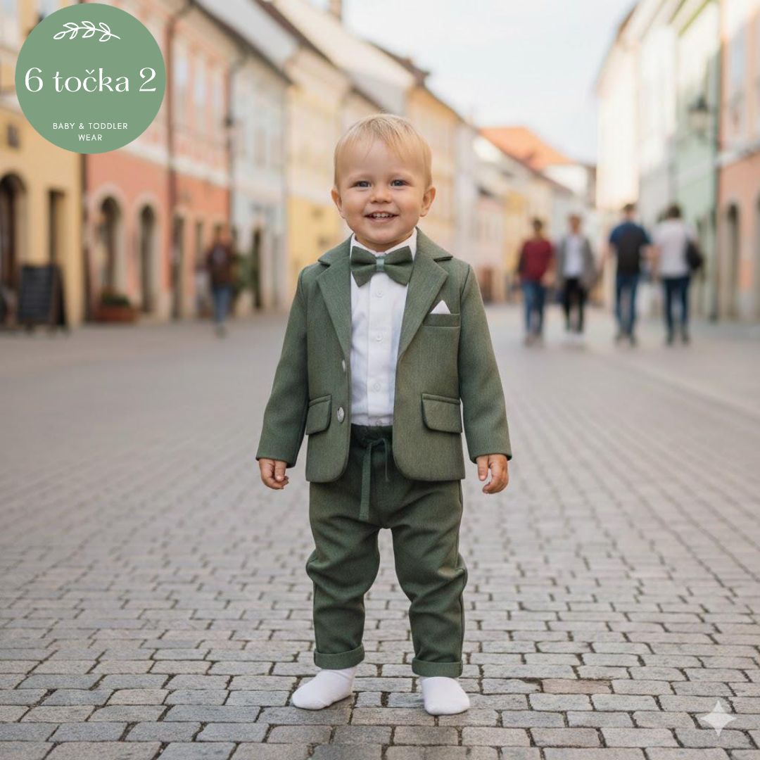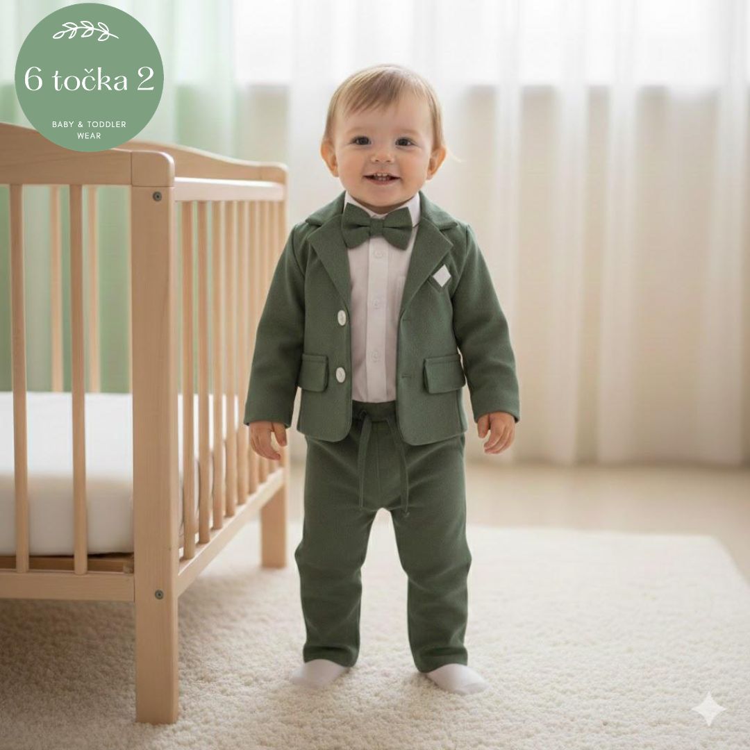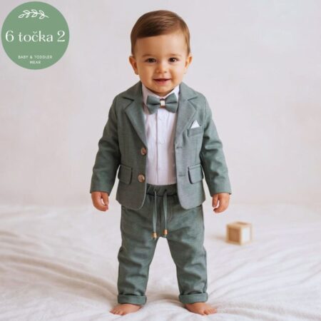 Tražite savršenu kombinaciju stila i udobnosti za svog mališana? Ovaj četverodijelni svečani set u modernoj maslinasto zelenoj boji dizajniran je kako bi vaš dječak izgledao poput pravog malog džentlmena, a da mu pritom ni u jednom trenutku ne bude neudobno.