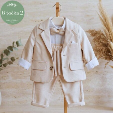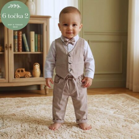 Košulja klasičnog kroja pruža udobnost i jednostavnost, idealna za kombiniranje s ostatkom kompleta. Sako je izrađen od kvalitetnih materijala koji daju odijelu elegantan, svečan izgled. Hlačice s regulacijom struka omogućuju savršeno pristajanje i slobodu pokreta, prilagođavajući se bebinom rastu i pokretljivosti.