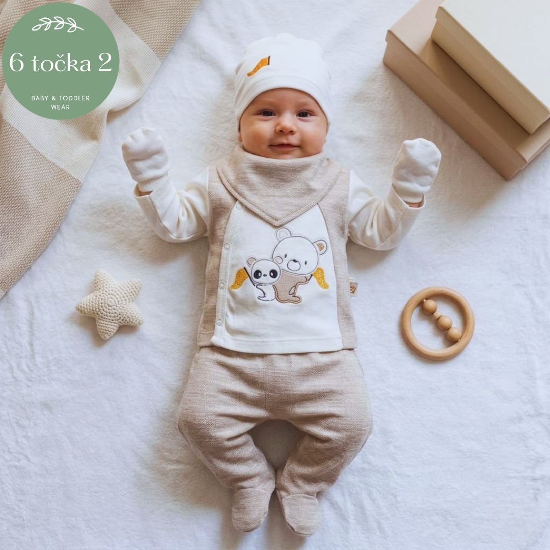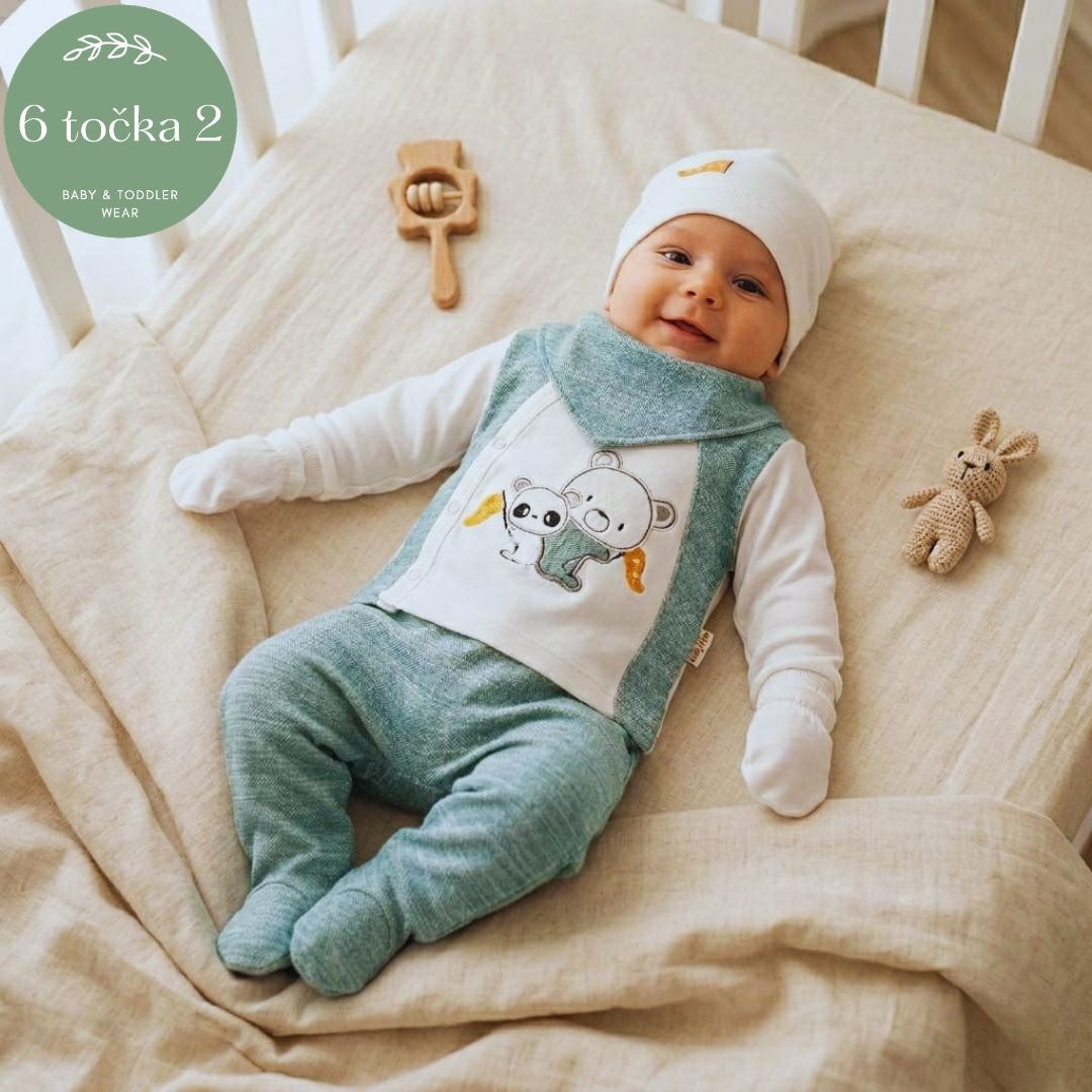 Osigurajte svom mališanu maksimalnu udobnost od prvog dana uz naš preslatki trodijelni komplet. Dizajniran s posebnom pažnjom prema osjetljivoj bebinoj koži, ovaj set spaja vrhunsku mekoću i praktična rješenja koja roditeljima olakšavaju svakodnevicu.