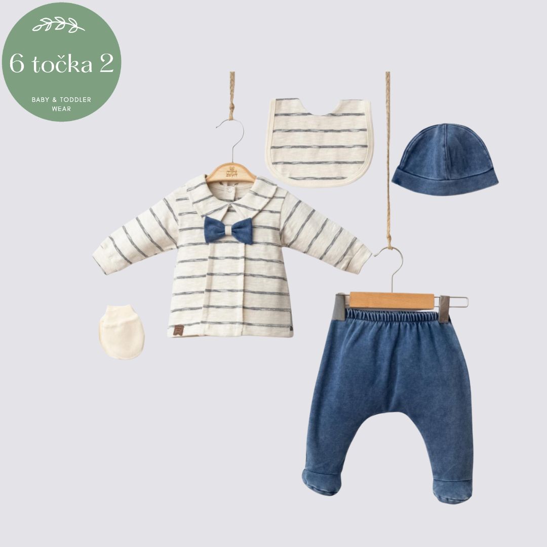Ovaj 5/1 set za izlazak iz bolnice sadrži benkicu, hlače, slinček, kapicu i rukavice. Set se koristi skroz do drugog mjeseca rođenja čak i dulje. Odličan je za poklon kao i za prvo vrijeme, lako se oblači i skroz je praktičan.