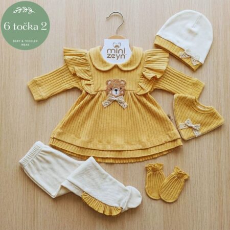 Učinite prvi dolazak kući nezaboravnim uz ovaj sofisticirani 5-u-1 set za djevojčice. Pažljivo dizajniran u toploj, modernoj oker boji, ovaj komplet spaja vrhunsku udobnost i nježnu estetiku za prve bebine uspomene.